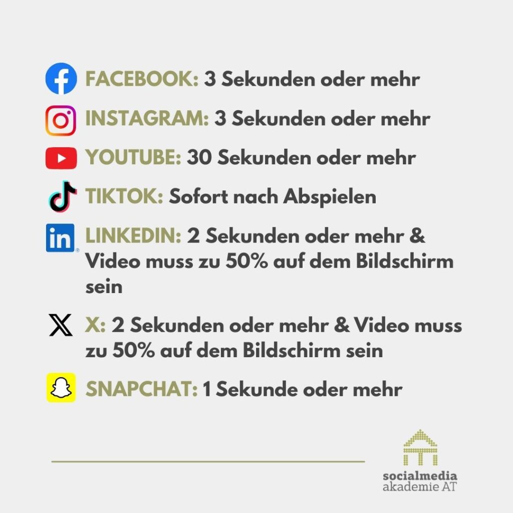 Für andere Plattformen sind die Regelung, was ein View ist, anders. Bei TikTok wird ein View beispielsweise direkt nach dem Anspielen gezählt, ähnlich wie bei Snapchat. Bei YouTube muss ein Video mindestens 30 Sekunden angespielt werden und bei LinkedIn und X muss das Video beim Anspielen zusätzlich auch noch auf mindestens 50% des Bildschirms zu sehen sein.